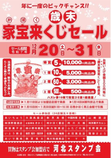 年末恒例の河北スタンプ会、歳末売り出し「家宝来くじセール」が開催されます!