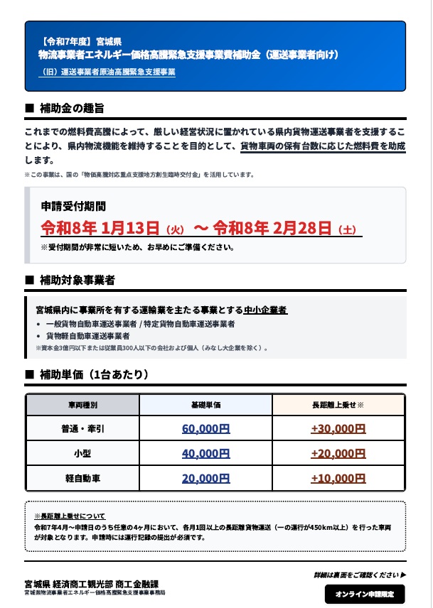 宮城県では、原油価格高騰により、厳しい経営状況に置かれている県内中小貨物運送事業者に対して、燃料費高騰分の一部を支援するため、標記補助金の募集を開始しました。